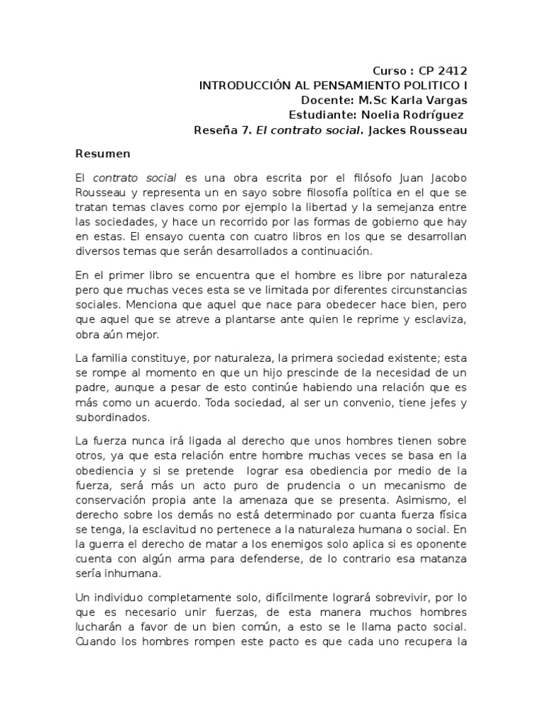 / El Contrato Social Rousseau Pdf - Ensayo De Contrato Social De Rosseau10 - Rousseau parte de la tesis que supone que todos los.